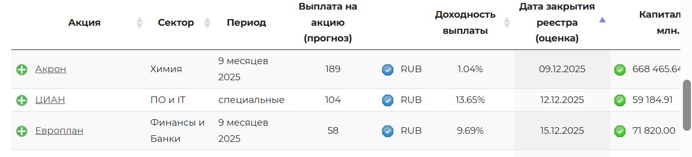 На сайте дохода акции с ближайшими большими дивидендами: Циан и Европлан. Циан у меня уже есть, выбираю Европлан, так как акции Циан у меня уже есть.